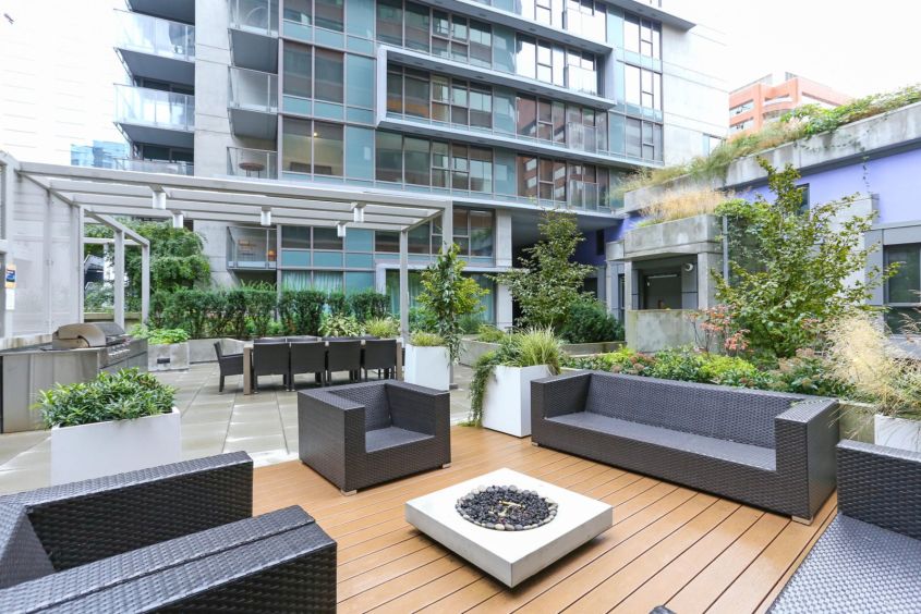 Nearby parks include Emery Barnes Park, Nelson Park, and May & Lorne Brown Park. Nearby schools include Roberts Annex Elementary School, Lord Roberts Elementary School, King George High School, and Rhodes Career College Ltd. The closest grocery stores are Sorento Market, Popeye's Supplements Vancouver, and Burrard Corner Store & Flowers. Nearby coffee shops include Betty at The Burrard, Starbucks, and Darryl's Coffee & Native Art Shop. Nearby restaurants include Tokyo Joe's, Deli O, and Subway Sandwiches Restaurant. Maintenance fees include Garbage Pickup, Gardening, Hot Water, and Management.