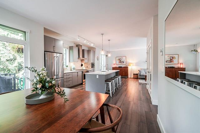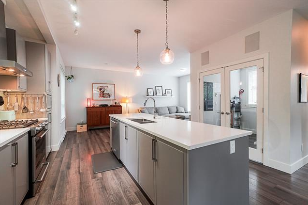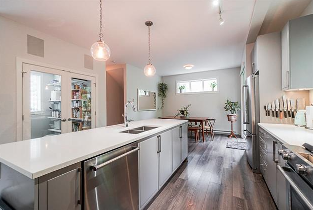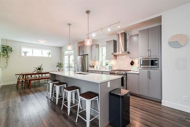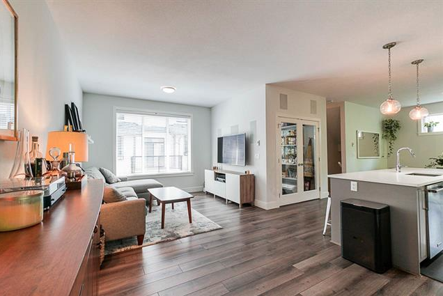 Modern 3 storey townhome by award-winning Streetside Developments. This spacious end-unit home is on a quiet, no-through street backing onto a private treescape. With 9'2" ceilings on the main level & an abundance of window, natural light flows. The kitchen features a huge walk-in pantry with French doors, 9' island, & KitchenAid appliances. Upgraded backyard with durable turf, gas & water bibs and privacy screens plus a deck off the kitchen. Large master bedroom with walk-in closet & spa ensuite with heated floors. Features a built-in speaker system, double garage & laundry room. Amenities include a fitness centre, party lounge, playground & garden plots.