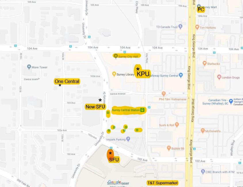 CENTRAL LOCATION! 3 min to SFU, KPU, Central City Shopping Centre, T&T Supermarket, Walmart, Surrey Central Skytrain Station, 1.2 min from SFU (new campus).