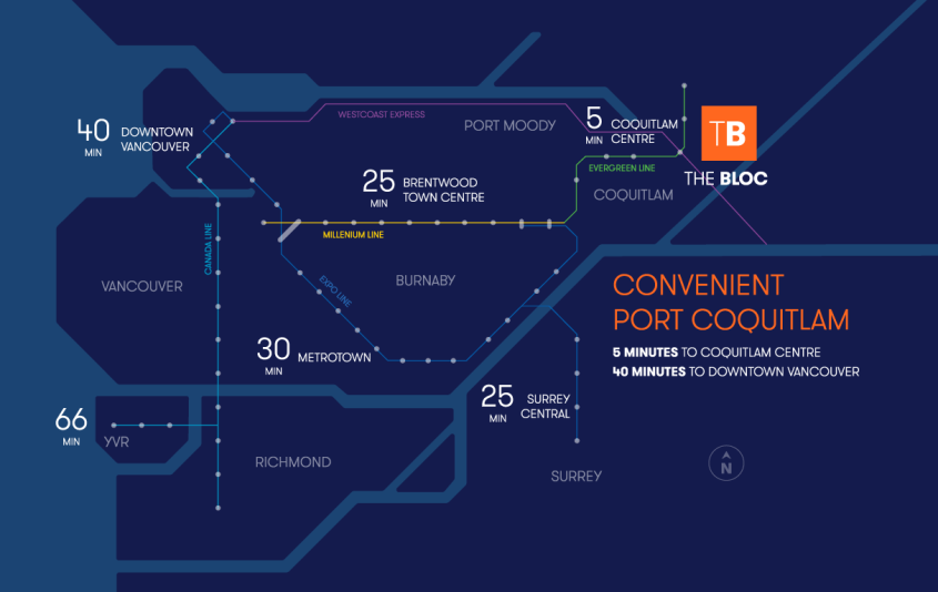 Welcome to THE BLOC by Maclean Homes. This SPACIOUS 1 BEDROOM + DEN, NORTH FACING unit features 9' foot ceilings, QUARTZ counters, S/S appliances, LAMINATE flooring throughout, shaker style cabinets, large island & open concept great room. The building amenities include: a pet washing station, bike repair station, bike lockers and a party room. The BLOC is centrally located, only 5 minutes from Coquitlam Centre and Coquitlam Central Station, your access to the Evergreen line and the West Coast Express. Just steps from the Poco Trail, Coquitlam River, restaurants, shopping & more.