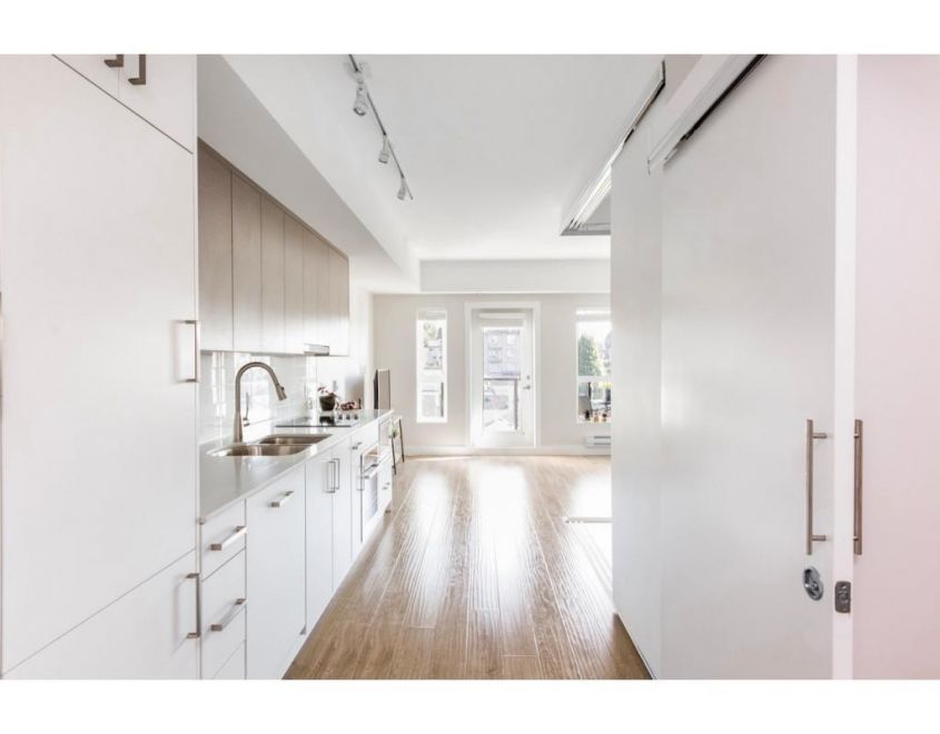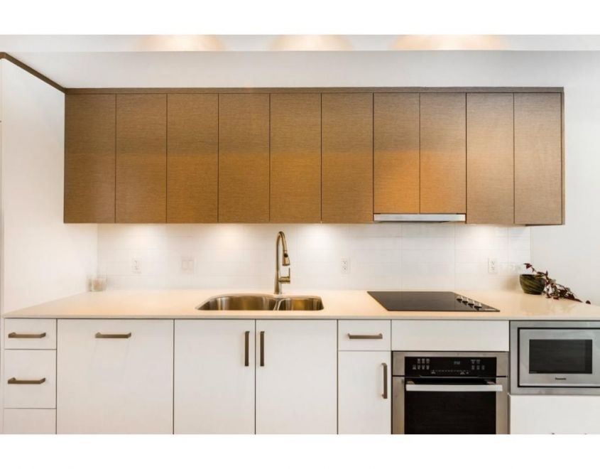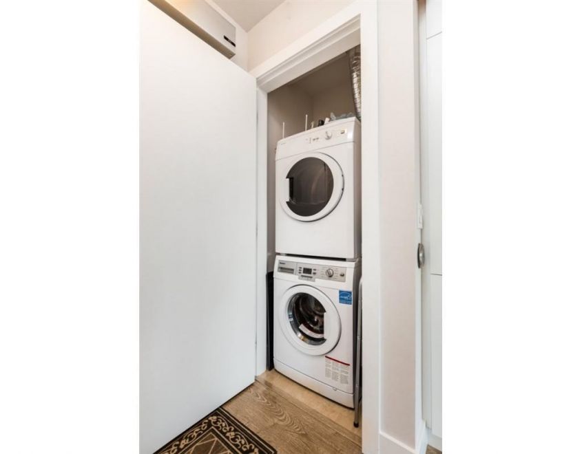 Features a Euro-style kitchen with panelled fridge & DW. Undermount sink with quartz counters, stainless stove & microwave. Laminate flooring. Sliding doors on bedroom, in-suite stacking W/D & 9' ceilings.