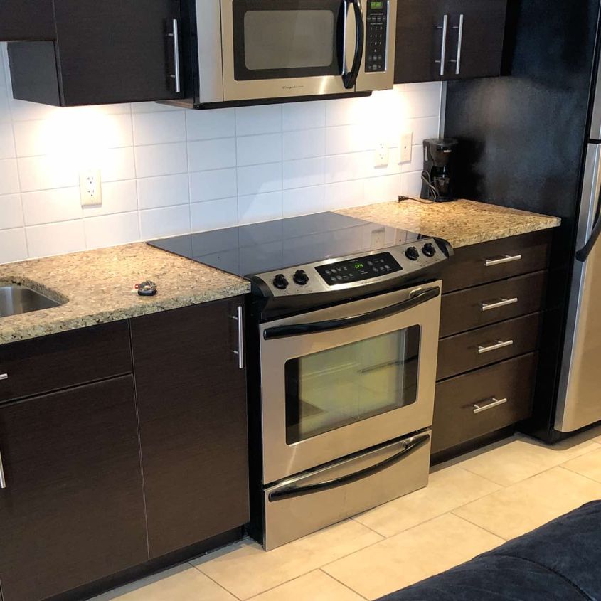 This cozy clean one bedroom suite includes everything you need for everyday living. Enjoy modern granite countertops, stainless steel appliances, in-suite washer and dryer, queen bed, flat screen tv & one parking stall. These sophisticated and modern condo towers offer a spacious place and peaceful neighborhood for families.